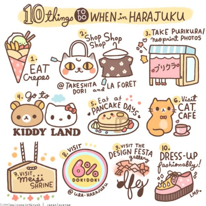 1. 吃可丽饼 2. 购物 3. 拍大头贴 4. 去KIDDY LAND(玩具店) 5. 吃Pancake Days(微笑松饼) 6. 去猫咪咖啡厅 7. 去明治神宫 8. 逛6%DOKIDOKI(原宿风指标性服饰店) 9. 去逛Design Festa Gallery(艺术展演空间) 10. 好好打扮自己!