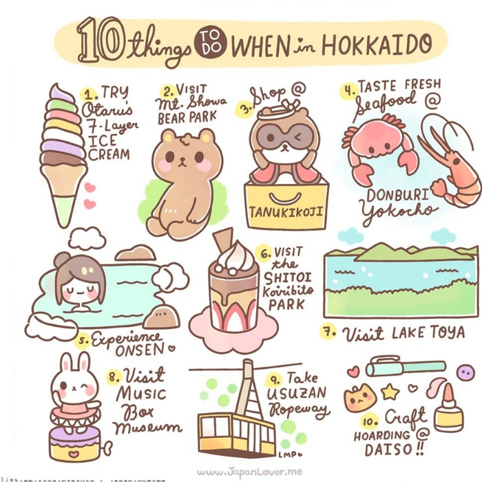 1. 试试小樽的七层彩色霜淇淋 2. 参观昭和新山熊牧场 3. 逛逛狸小路商店街 4. 到盖饭横丁市场品嚐海鲜 5. 泡温泉 6. 去白色恋人公园 7. 去洞爷湖 8. 去小樽音乐盒堂 9. 搭有珠山缆车 10. 去大创买手做杂货