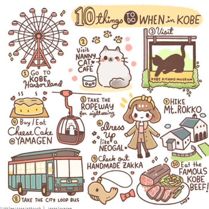 1. 去神户临海乐园(Harborland) 2. 去猫咪咖啡厅 3. 参观北野异人馆 4. 吃Yamagen的起司蛋糕 5. 搭缆车看风景 6. 打扮得像个Neo Gal 7. 登上六甲山 8. 搭City Loop循环巴士 9. 别错过手工杂货 10. 尝尝超有名的神户牛肉