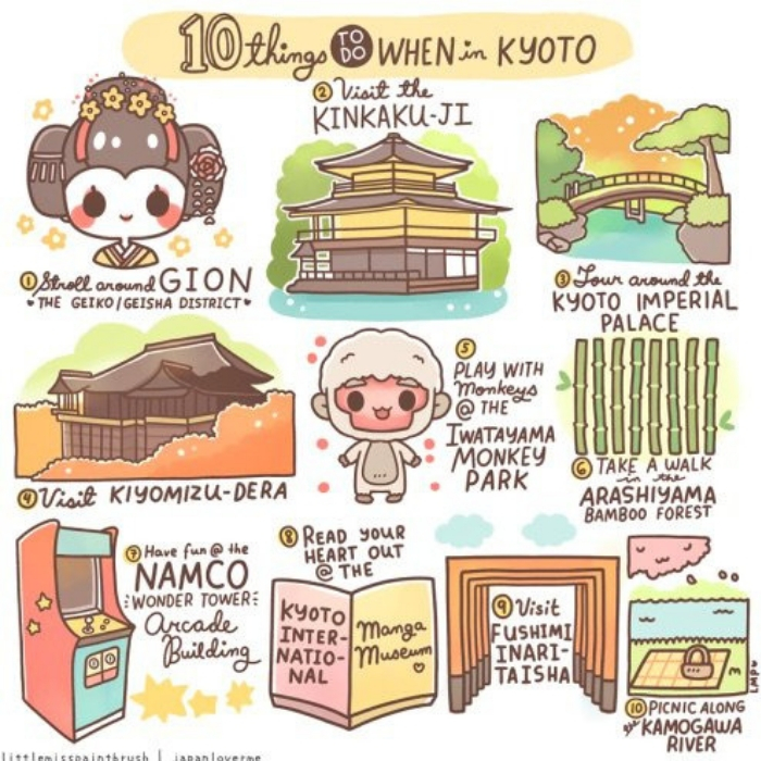 1. 在祇园散步 2. 参观金阁寺 3. 到京都御苑走走 4. 去清水寺 5. 去岩田山猴子公园跟猴子玩 6. 在岚山的竹林里散步 7. 到namco WONDER TOWER玩游戏机 8. 去国际漫画博物馆 9. 去伏见稻荷大社的千本鸟居 10. 在鸭川旁野餐
