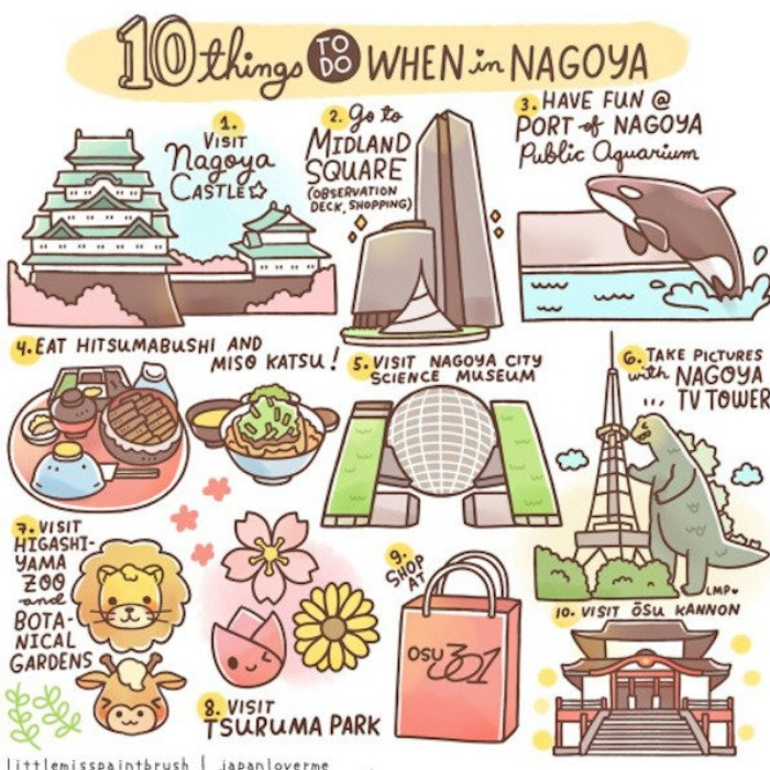 1. 参观名古屋城 2. 去MIDLAND SQUARE逛街看夜景 3. 去名古屋港水族馆 4. 享用鳗鱼饭三吃以及味噌猪排 5. 参观名古屋市科学博物馆 6. 和名古屋电视塔合照 7. 去东山动植物园 8. 去鹤舞公园 9. 逛大须商店街 10. 去大须观音寺