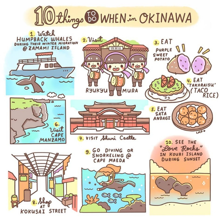 1. 去座间味岛观赏野生座头鲸 2. 参观琉球村 3. 吃红芋 4. 吃塔可饭(Taco Rice) 5. 吃冲绳式炸甜甜圈(Sata Andagi) 6. 去万座毛 7. 参观首里城 8. 逛国际通 9. 去真荣田岬潜水或浮潜 10. 日落时分在古宇利看心型礁岩