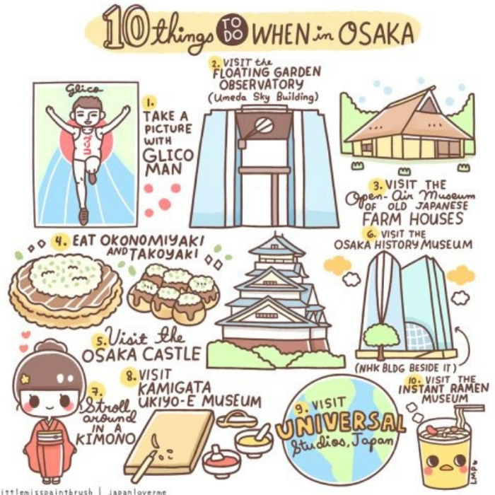 1. 和固力果先生合照 2. 造访梅田蓝天大厦的空中庭园展望台 3. 参观日本民家集落博物馆 4. 吃大阪烧和章鱼烧 5. 参观大阪城 6. 参观大阪历史博物馆 7. 穿着和服散步 8. 参观上方浮世绘馆 9. 去环球影城 10. 参观拉面博物馆