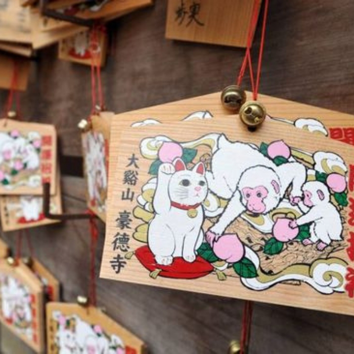 豪德寺的三重塔有许多猫咪的踪迹,塔的一层四面都是按照顺序刻着十二生肖的木像,生肖鼠的位子则是卧着一只猫咪。豪德寺为了供奉「招福猫児(まねぎねこ)」、在寺里建造了「招猫殿」里面安放了招猫观音。招猫殿旁边、放了很多招福猫。招福猫是右手上举、手中没有拿小金币的白色小猫。和左手上举手中拿小金币的招财猫有区别。