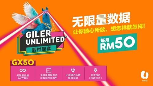 U Mobile 目前的配套中,也有给予游戏玩家的利好,如 Giler Unlimited 后付 GX50,每月只需 RM50 就能让用户和游戏玩家尽情享有无限量数据。签购 U Mobile 可全天候享有无限量数据,无隐藏收费。