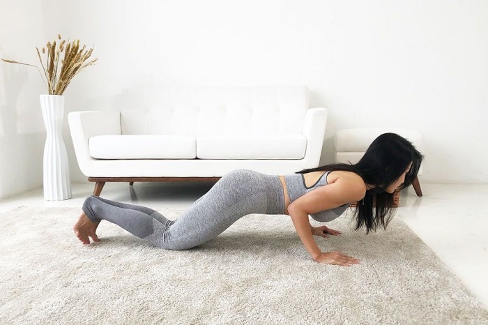 开始时需要面向地下,双膝跪地,大腿与小腿成90度角,双手打开至肩膀阔度,并以掌心轻力支撑上半身。