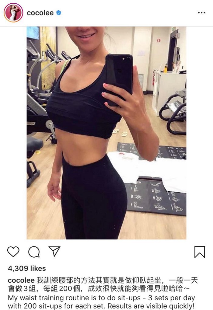 李玟几乎每天或是隔一天就运动,每次运动一个半小时,如果真的太忙碌的话,她也会尽量做30分钟的有氧运动,包括瑜伽、拳击等。与此同时,李玟每天都会做600下的卷腹运动,可想而知要平坦的小腹真的不是靠躺着就可以的。