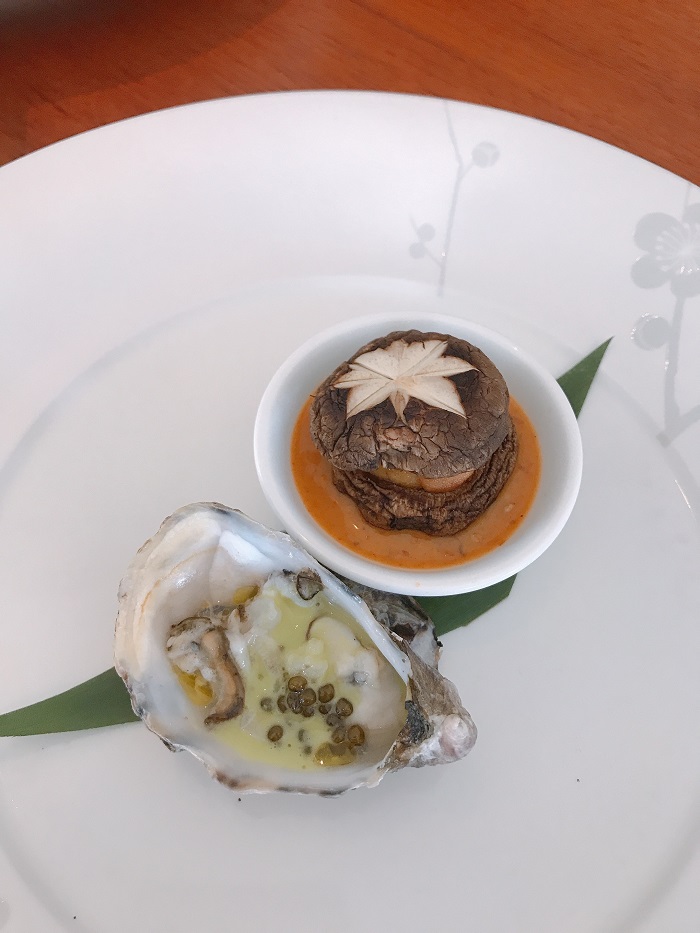 未正式介绍这道料理前,容许我先鼓掌欢呼!生蚝配鱼子酱提鲜入口就是一种海洋荡漾的滋味,鲜到一个境界。另一道菌类夹海胆简直让人魂牵梦绕,这是情人节套餐内其中让E编印象最深刻的料理,从摆盘到味道无懈可击。