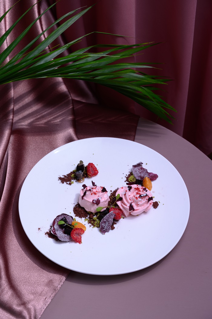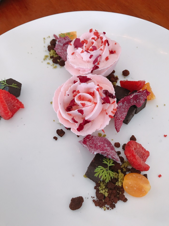完结篇上来的玫瑰慕斯甜品极有情人节的情调,玫瑰慕斯在舌尖上散发迷人的玫瑰香,配着新鲜莓果和黑巧克力果冻,酸甜微苦多层次的好滋味,足以见识到主厨的功力和创意。