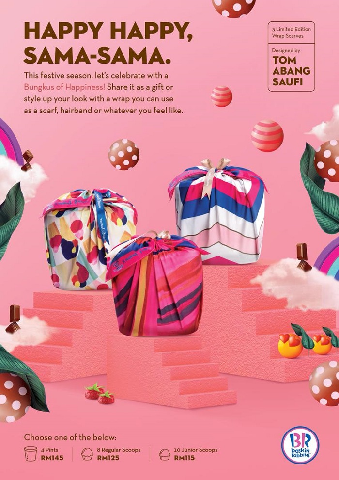 Baskin Robbins 最近有新搞作哦!他们与本地知名服装设计师 拿督 Tom Abang Saufi 旗下的 TAS 品牌联乘 合作推出期间限定的「趣乐包」(Bungkus of Happiness)!她亲手打造 3 款充满童趣,现代时尚和优雅的布包巾,寓意着大家将欢乐的冰淇淋「打包」带回家,与家人㇐起分享这份幸福感,这绝对是开斋节最佳礼品之一也突破传统,为市场上打开先河!