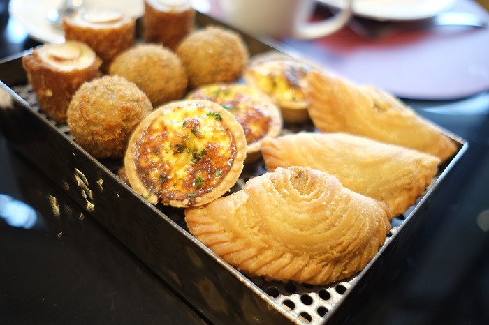 热食方面,分别有curry puff、鸡香肠卷等炸的食物,还有一碟很诱人的三明治,那流心cheese可说是让人难以自拔啊!再来,到了甜食,服务员会端一个大盘子出来,讲解了每一道甜品的名字后,你可以自己选择你要吃的甜品,服务员会稍后为你端上。当你吃完之后,你还可以品尝其他甜品哦!我觉得啊,午餐吃得清淡点,来这里品尝下午茶就最过瘾了!
