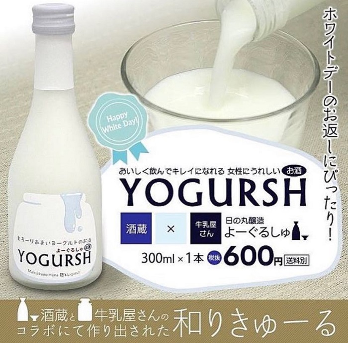早前大家热烈讨论的可减肥的啤酒之后,如今又有一个兼具美容和保健的乳酪日本酒,真是女生们的佳音啊!这个Yogursh乳酪酒是由秋田县横手市的日之丸酿造所生产,这是一款由乳酪和甜酒依比例调制而成的乳酪酒。甘酒的甜度搭配乳酪的酸度,甜中带酸,很讨人喜欢的口味。