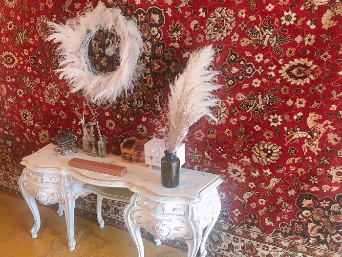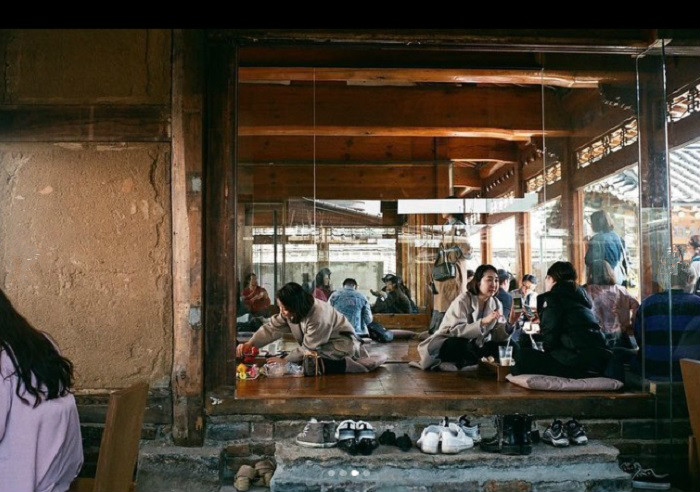 整间店是方形的四合院建筑,一半作为咖啡吧台和面包展示区,另一半是传统韩屋型的座位区。大门前方空地也设计成座位区,摆了几张木桌椅和矮桌,不习惯在韩屋内盘腿坐的人,可以坐在户外区比较舒服些。