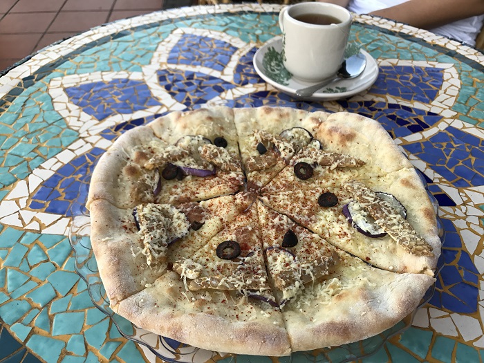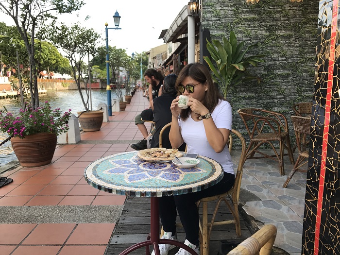 这里到处都是人情味啊!Voyage Together是大马著名艺人Aki和她丈夫经营的一家民宿咖啡馆。店的前方是homestay,走到后面就是很有特色的咖啡馆。最吸引我们的点是,咖啡馆就在马六甲河畔旁,有种在威尼斯河畔边喝茶的feel,很国外的感觉啊!这里主打的是pizza,在西式的pizza中加入当地的特色,是老外所喜欢的mix and match。