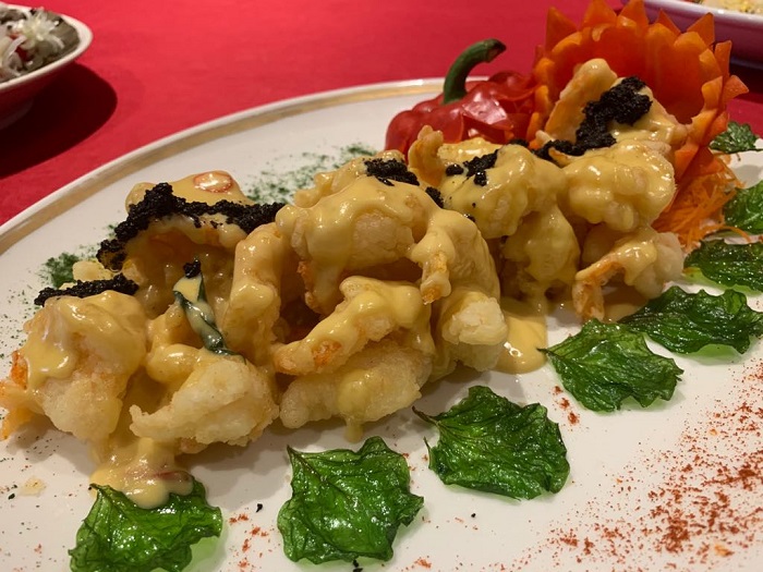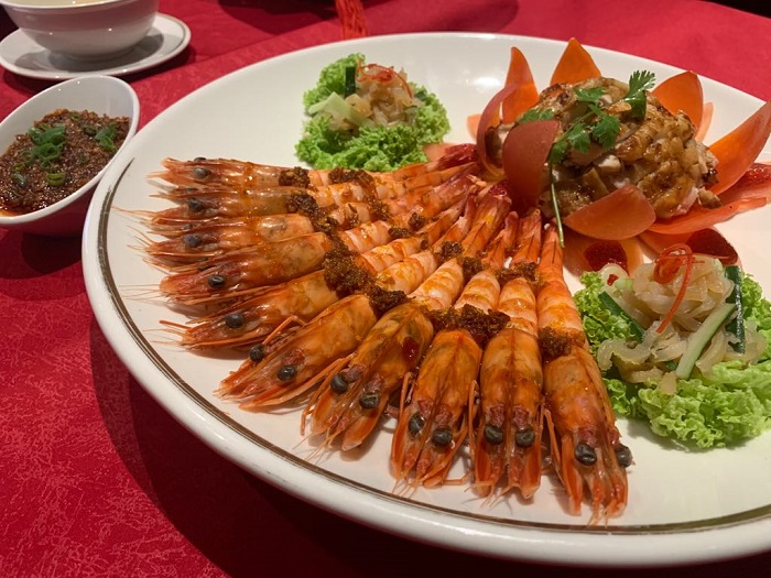 龙凤呈祥鸿富贵(麻辣虾球拼盐焗鸡海蜇)带有一点四川麻辣香味的虾,很开胃呢!