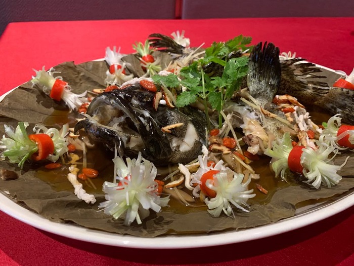 丰年庆有余(荷叶蒸龙虎班)用荷叶铺在盘子上,让蒸鱼增添了荷叶的香气,鱼的肉质也很新鲜。