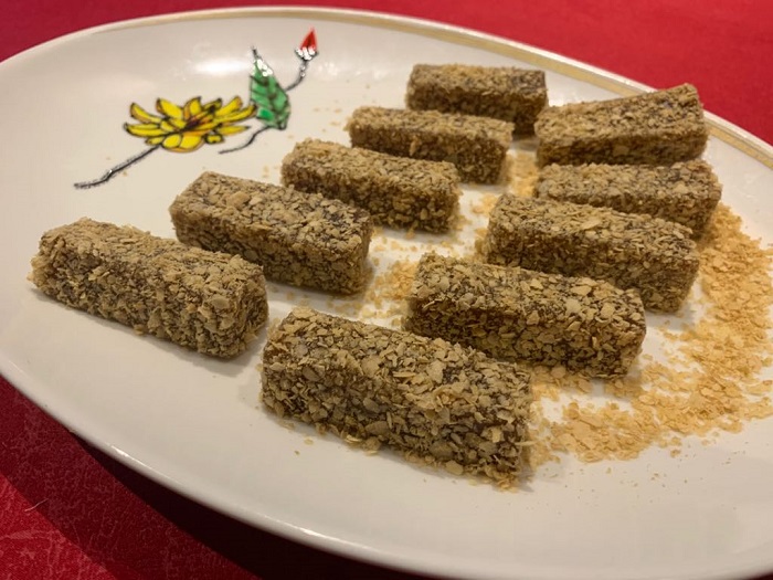 步步高升(蜜片年糕)把年糕沾上麦片,吃起来更有口感,而且还多了麦片的香味。