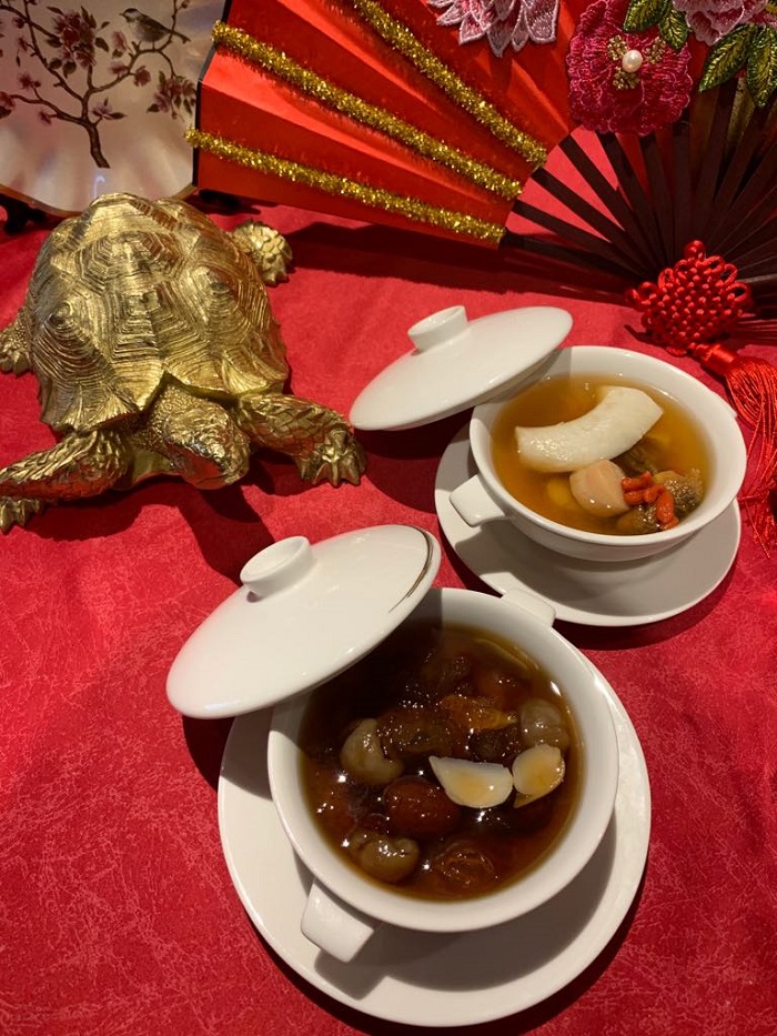 【前到后】年年顺景(松茸菌干贝炖花胶汤)清甜的花胶汤,分量和用料也太有诚意了吧~每喝一口都感觉是精华啊!共享合家团唱乐(桃胶罗汉果百合茶)滋补养颜啊!这绝对是我们女生最爱的甜品!