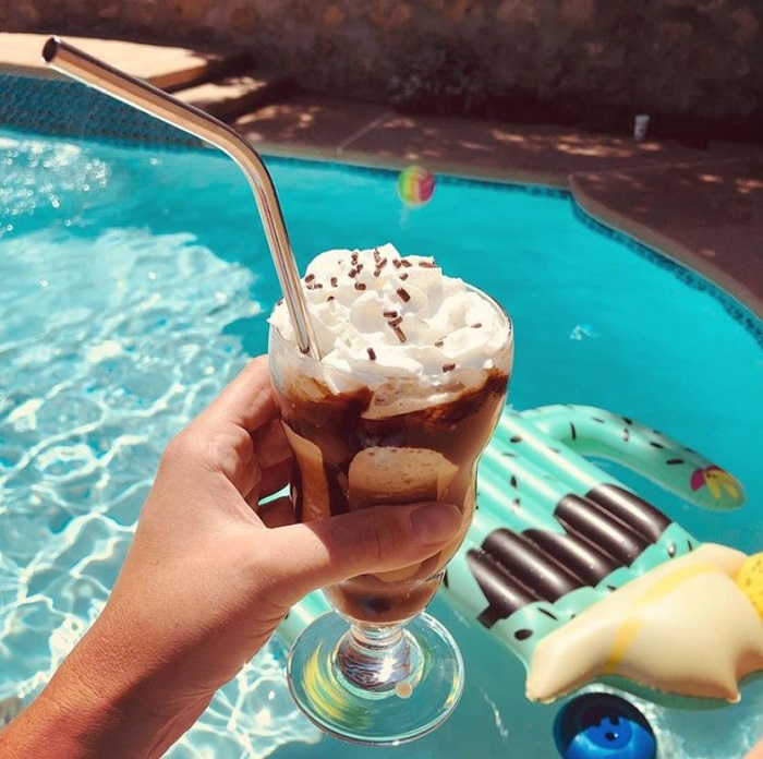 2:将混合后的咖啡倒入玻璃杯中,在上面加鲜奶油,最后视个人喜好淋上巧克力糖浆。