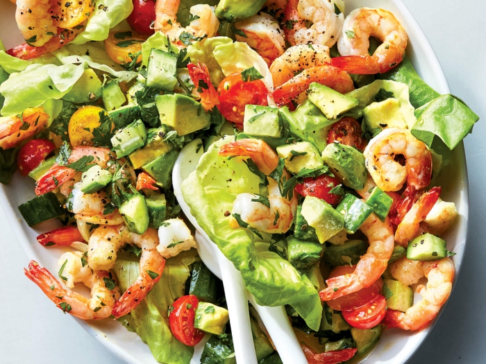- 把综合沙拉叶放入精致的碗中,接着加入鲜虾、小番茄、牛油果以及酱料,最后撒上核桃一起搅拌即可。