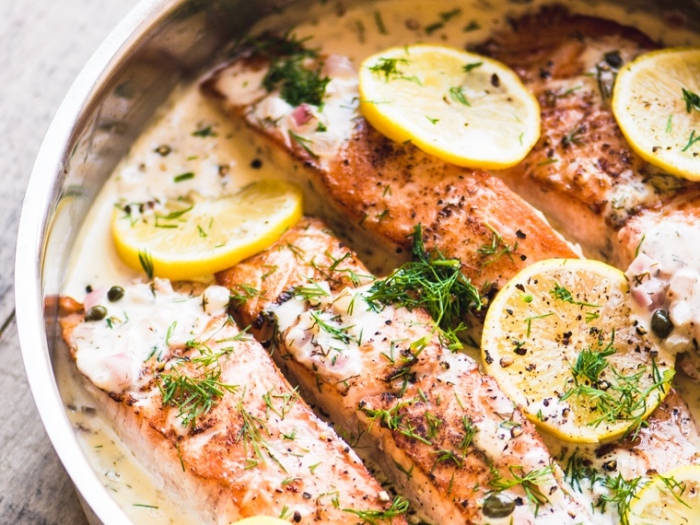 三文鱼菲力 1 块 、蒜头 1 瓣 、柠檬 1/2 颗 、白酒 50ml 、鲜奶油 100ml 、玉米淀粉 1/2 茶匙 、Dill 1/2 把 、盐 适量 、黑胡椒 适量