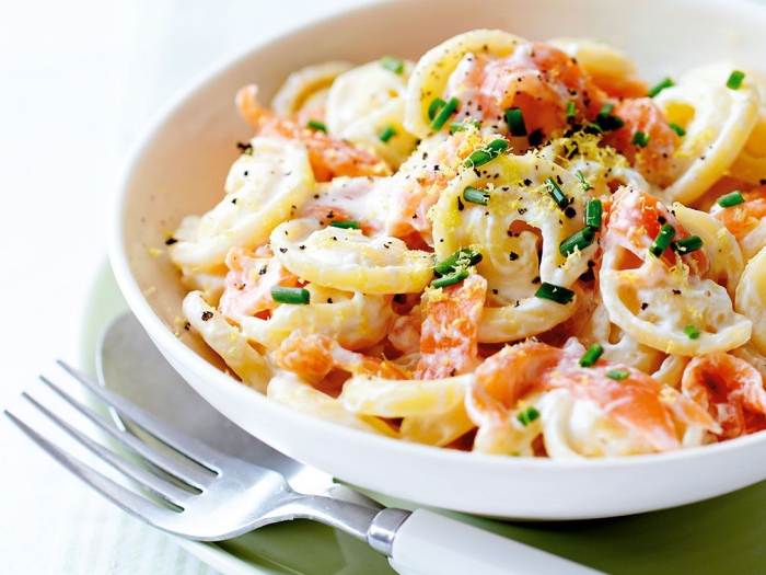 意大利面 300g、蒜头 3 瓣 、洋葱 1/2 颗 、鲜奶油 5 大匙 、柠檬汁 1 颗 、Parmesan Cheese Powder 2 大匙 、白酒 50ml 、烟熏鲑鱼 200g 、芝麻叶 70g 、盐 适量 、黑胡椒 适量