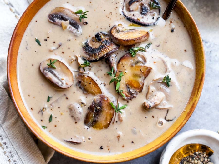 - 把汤盛入碗中,淋上适量的牛奶,然后加上预先备留的菇和腰果,撒上 Parsley 作为点缀即可上桌享用。