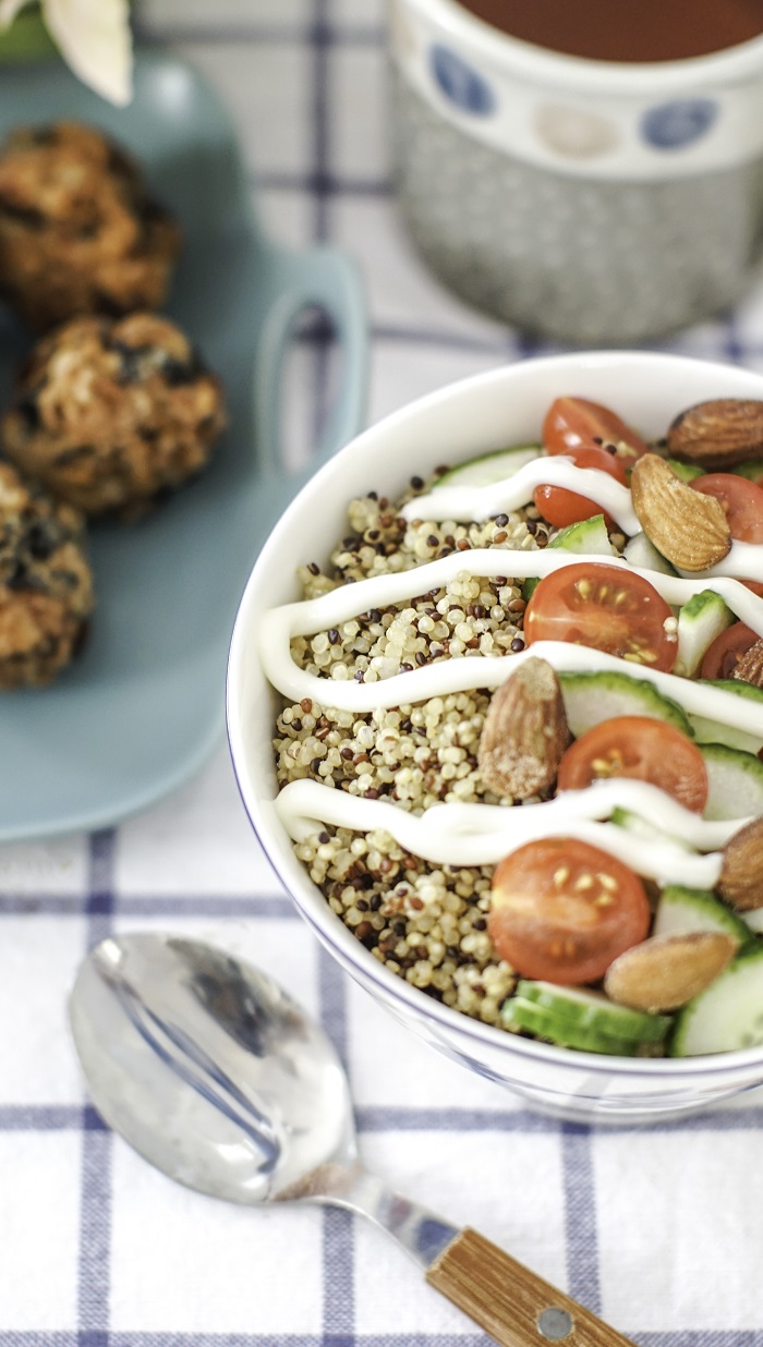 3. 把小米、黄瓜、樱桃番茄和杏仁倒入一碗中,加入做好的酱汁,拌匀即可食用。