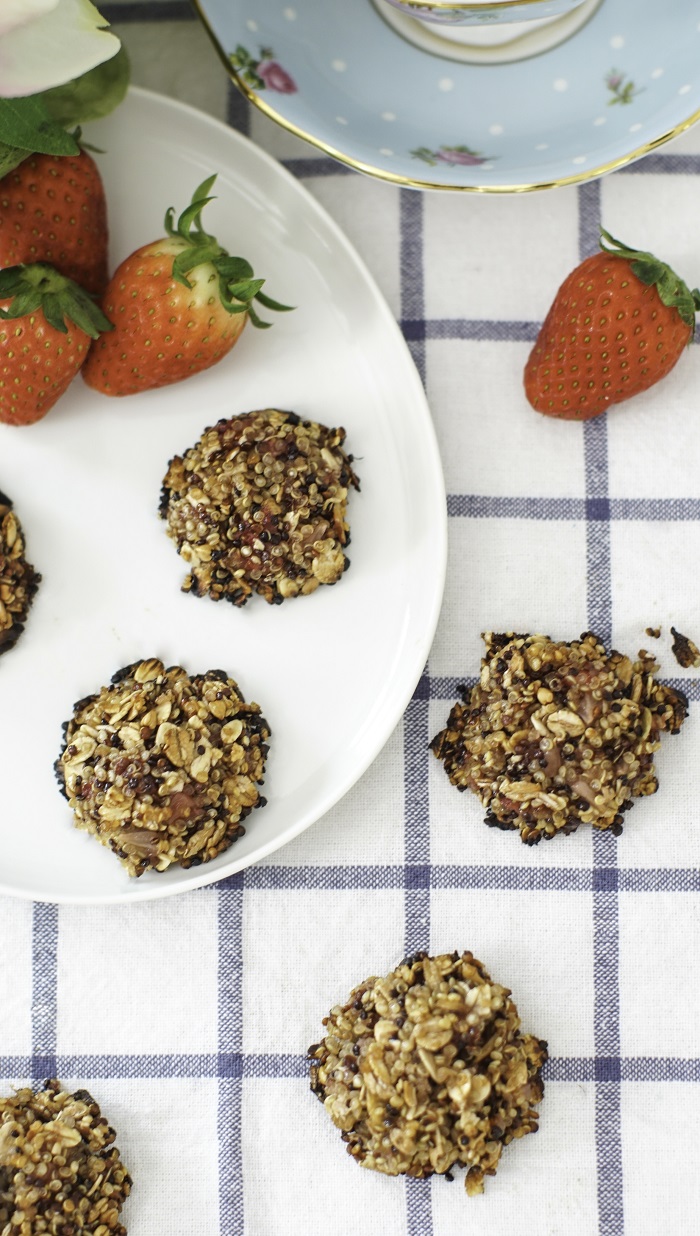 4. 把糖浆和小米倒入混合均匀的面糊中,搅拌均匀后,用汤匙勺面糊放在烘培纸上,放入180度烤箱,烤大约15分钟,放凉后即可食用。