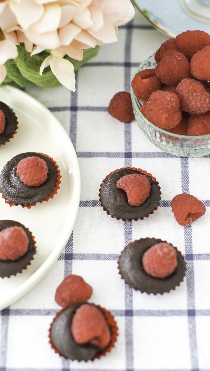 3. 勺一小匙的小米巧克力倒入小点心纸杯中,整平成底,再勺入2小匙的巧克力酱,放上覆盆子,最后送入冰箱冷藏30分钟即可。