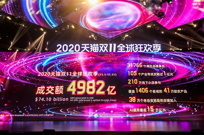 2020天猫双11全球狂欢季完满结束,为期11天的活动共录得商品成交额(GMV)4,982亿元人民币(相当於741亿美元),较2019年同期增长26%。