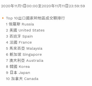 ⭕ 以GMV计算,美国成为双11期间商品销往中国最多的国家,其他热门进口国家(按英文字母排序)为澳洲、加拿大、法国、德国、意大利、日本、韩国、新西兰及英国。