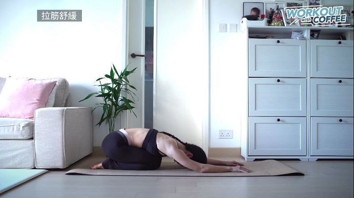 最后来个趴着拉筋舒缓,双腿跪坐在瑜伽垫上,双手向前伸直,这样能帮忙舒缓背部肌肉。