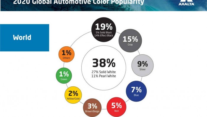 今年最受欢迎的颜色是白色,有38%的汽车是该色系,27%的销售车辆为纯白色,其中11%为珍珠白。排在第二名的是黑色,占19%,灰色则位居第三,占15%。灰色在黑色的基础上有所增长,增加了两个百分点,冲到了10年来的最高点。白色则在过去三年里一直稳定在全球市场的38%。