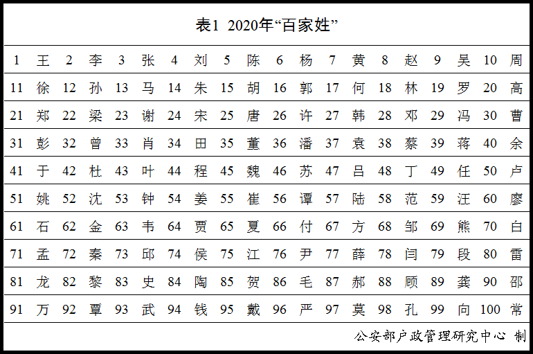 中国发布了2020年全国姓名报告,包括百家姓TOP 100以及新生儿名字使用频率最高TOP 50。