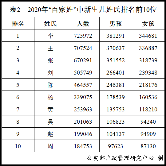 2020年“百家姓”中新生儿登记姓氏TOP 10