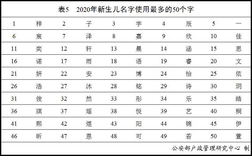 至于新生儿名字中使用频率最高的50个字依次为“梓”、“子”、“宇”、“辰”、“一”等;去年TOP 4则是“玥”、“伊”、“昕”、“可”。