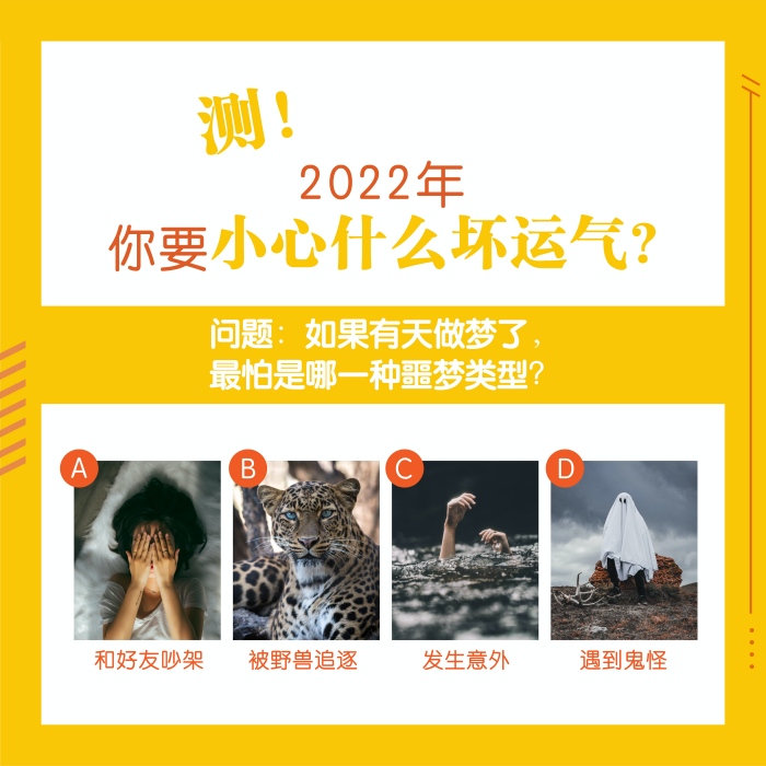 终于迎来了全新的一年,说实在有没有超级好运气也不强求,但就怕遇到未知的不顺遂和坏运气,根据你内心最害怕的噩梦类型,做个心理测验看看2022年的你会遇到哪方面的烦恼吧!