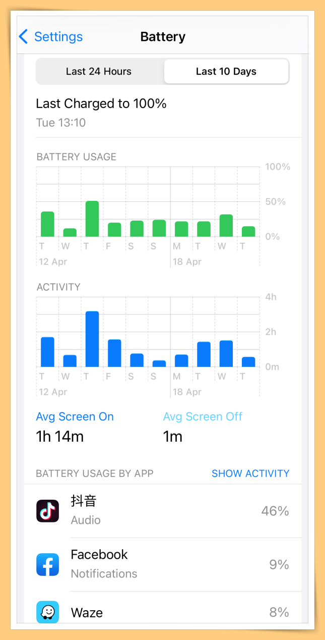 在iOS 15中,果粉可以在“Settings”,“Battery”中查看过去24小时或过去10天的App用电数据,从中可以了解到哪些App特别耗电。如果发现有些App没有使用,但还出现耗电的情况,那可以考虑删除改App。