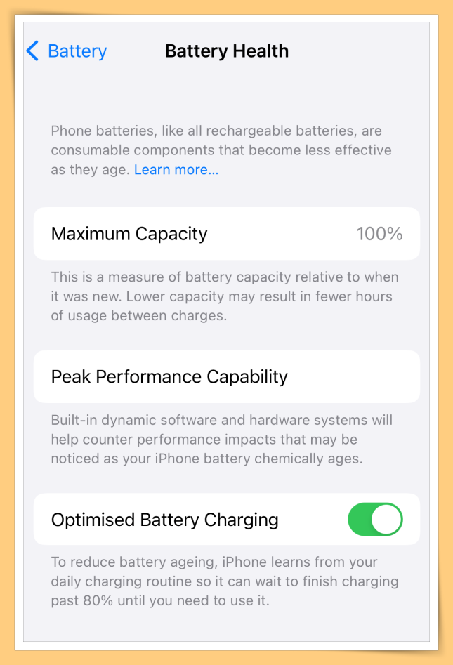 在手机“Settings”,点击“Battery”,再点击“Battery Health”,若发现iPhone的电池低过80%,这意味着电池有老化的问题,也可以考虑换新电池了。此外,也建议打开Optimised Battery Charging(优化电池充电),能延迟电池老化问题。