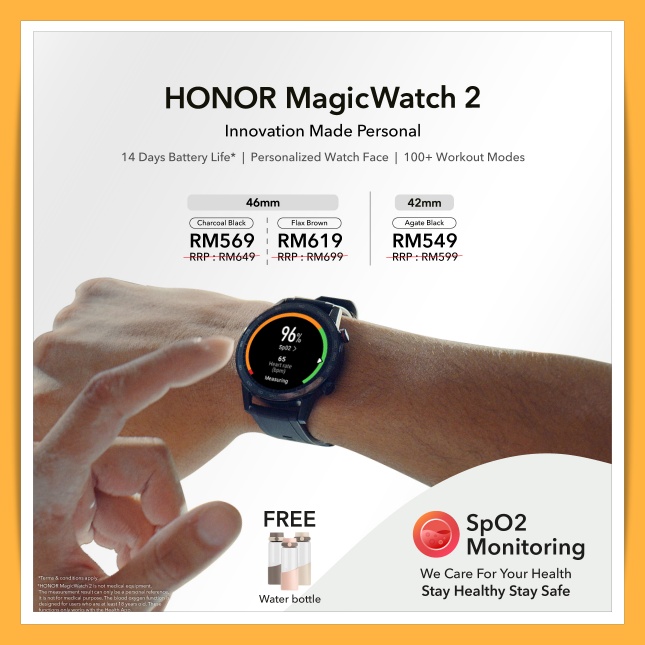 智能手环不适合你?那可以选择智能手表,HONOR MagicWatch 2 折扣RM80,优惠价是RM619就可以购买,而且还获赠一个水瓶。 赠品有限,先到先得,送完为止!