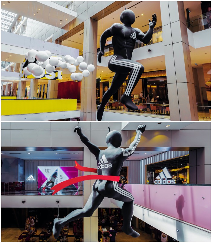 配合新店开张,adidas 还在Pavilion 广场内设置了「Athletes on the move」巨型人体模型,每个穿上adidas BOOST科技的人体模型都会指引大家走向位于5楼的新店位置,而且每个都象征着运动员的精力和正能量,渴望和大家走向巅峰,相当有意思!