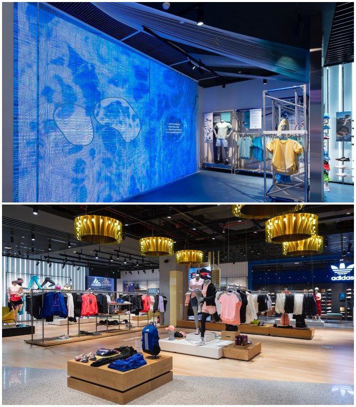 来到店面记得要到这一个提倡环保的专区,在这里会看见品牌用再造丝绳打造的艺术装置,还有酷炫的LED屏幕,在这里可以看见海洋塑料垃圾给地球带来的污染和负担,而adidas也在努力希望能在2024年后,所有产品都改成可回收聚酯纤维(polyester)来制造。