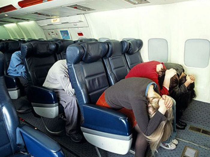 真相:这个误解真的让航空业哭笑不得!这个动作有个学名叫做「防冲击姿势 brace position」,在受到冲击的时候,人体会迅速前倾而撞上物体,而这个姿势能减少四肢和头部的伤害。北欧航空在1991年时曾紧急降落,因为乘客都有按照指示采取防冲击姿势,只是让部分乘客受伤,但无人丧生。
