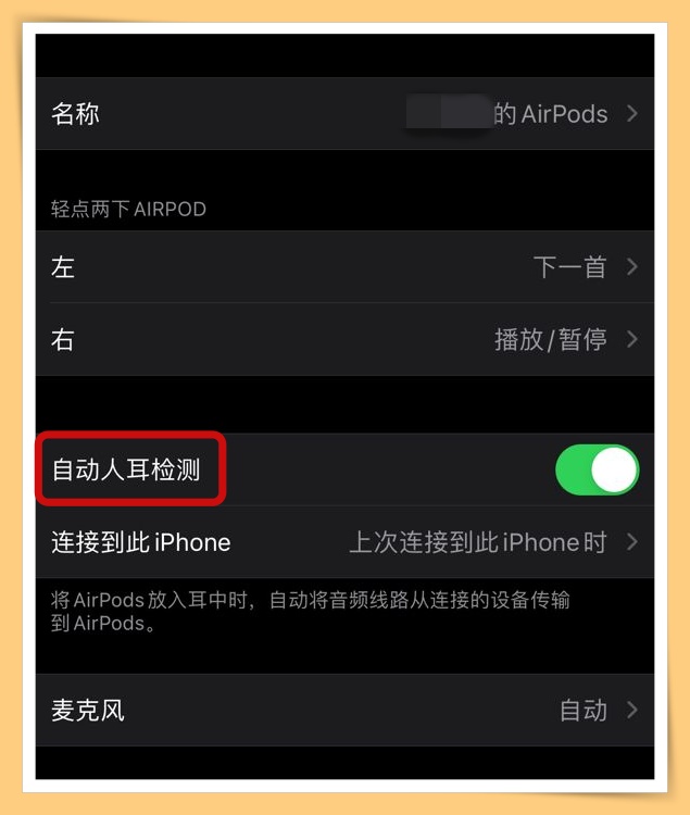 关闭后,当你从耳朵取下 AirPod 时就不会暂停音乐;同样的如果你手动暂停播放音乐,并取出其中一个 AirPods 然后再放回耳中,它也不会自动恢复播放。
