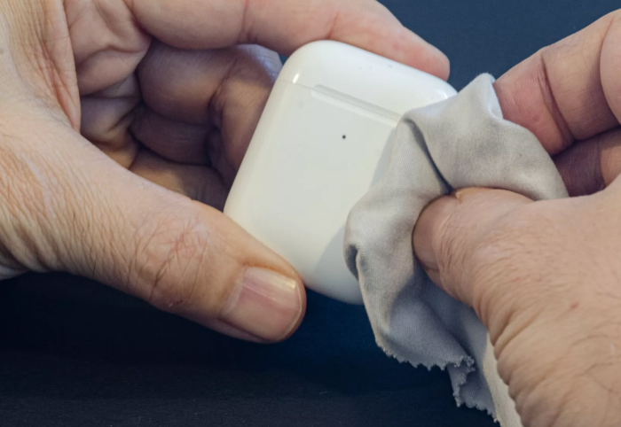 在佩戴AirPods的时候如果接触了汗水、肥皂、彩妆品、防晒霜和乳液等刺激皮肤的液体后,一定要清洁并擦干耳机,这些都是会造成污渍的物质,另外,擦干净后耳机必须完全干透再放入充电盒中,充电盒也可以倒置将它晾干后再使用。