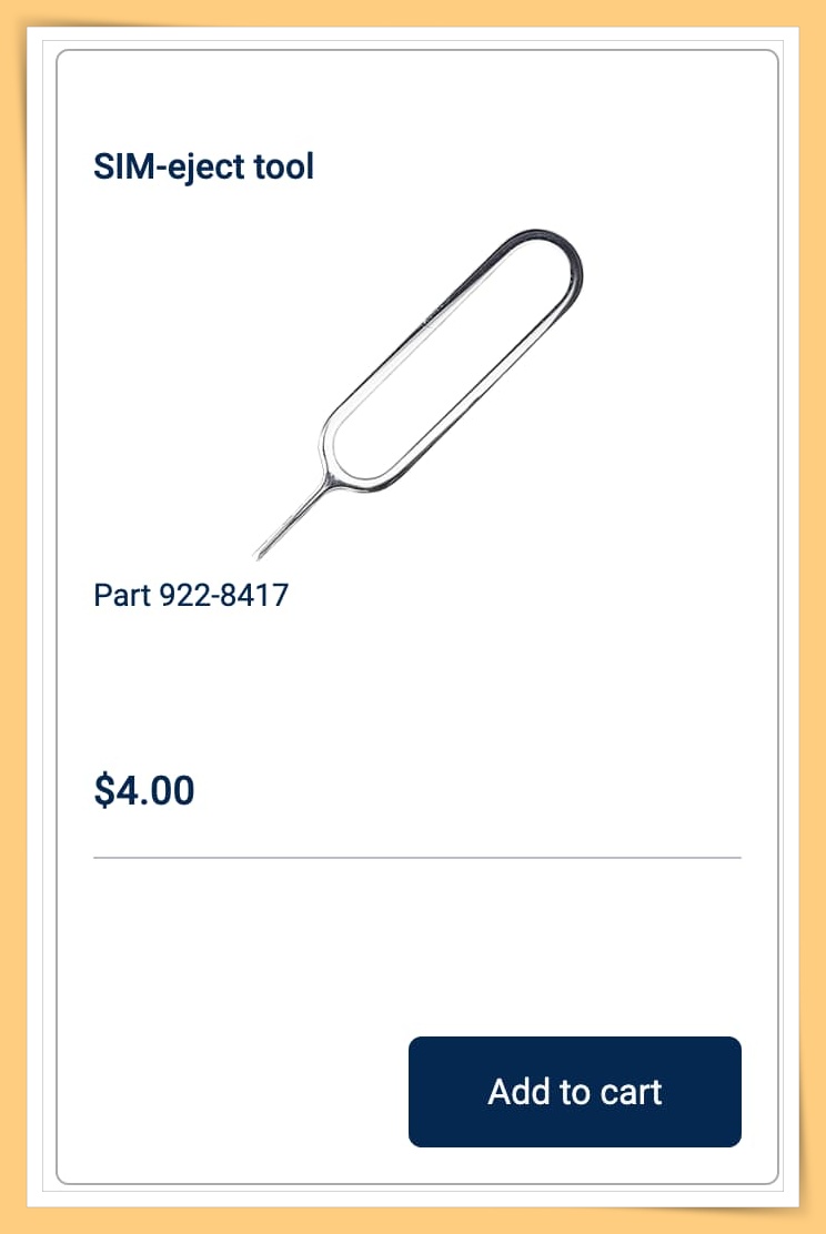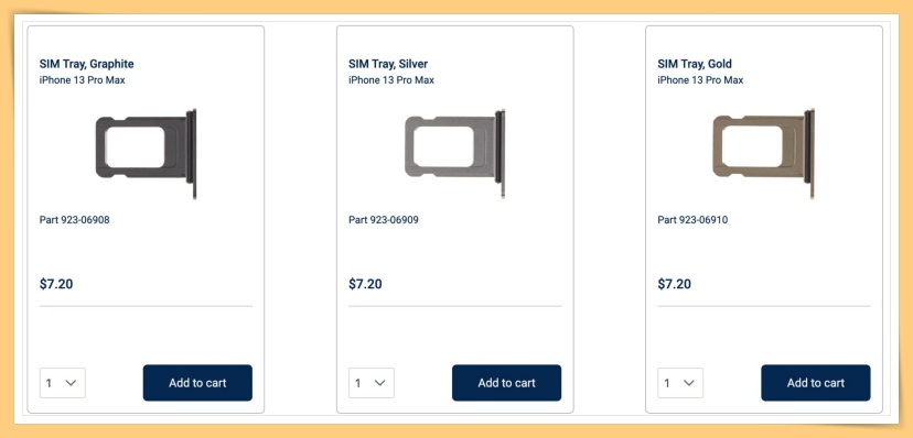 Apple的自助维修服务提供大量iPhone最常坏的零件,其中有电池、屏幕、相机镜头等,目前都可以透过官网直接购买,没想到的是竟然发现也有iPhone SIM卡托盘和 SIM取卡针也有售卖,而且售价也是也非一般的价格。