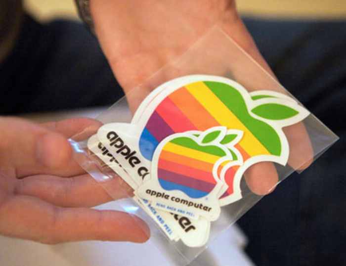而成立90年代的苹果,当时濒临破产准备翻身时,就注意到了「贴纸文化」,因此让苹果logo的贴纸首次放入Apple II电脑包装内,初期的logo还是彩色的哦!