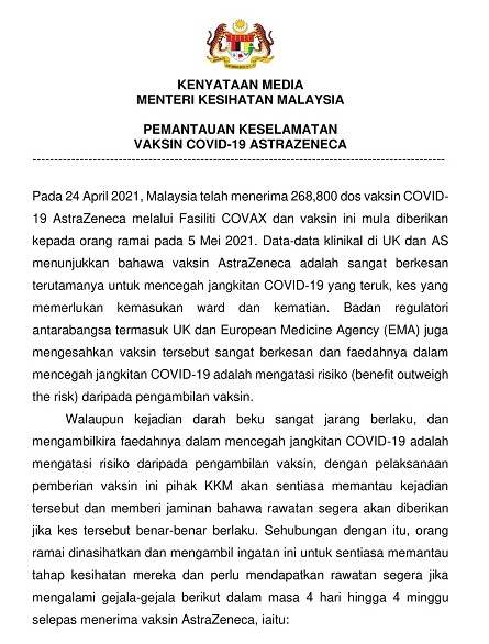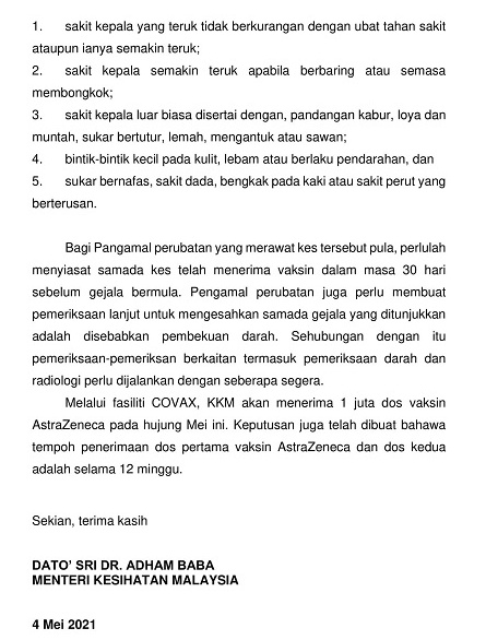 卫生部长阿汉峇峇发文告也提醒民众,在接种疫苗后的4天至4周内出现“严重症状”,必须立即求医,以让医生检查患者所出现的症状是否由血栓所引起;同时也必须尽快安排相关检查,包括验血和放射诊断(Pemeriksaan Radiologi)。