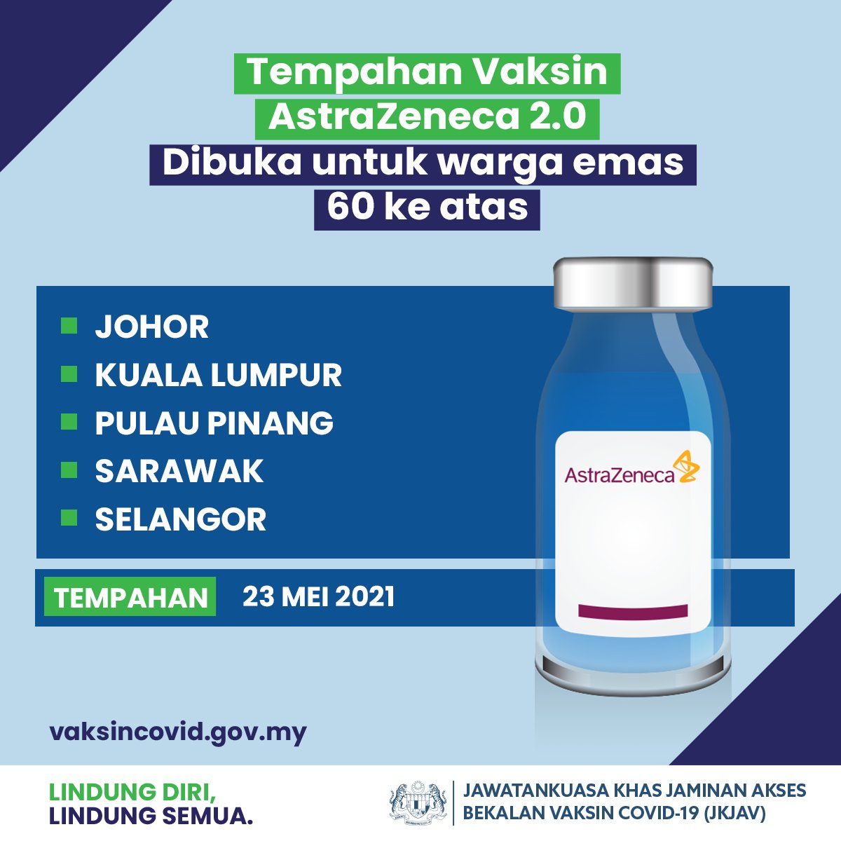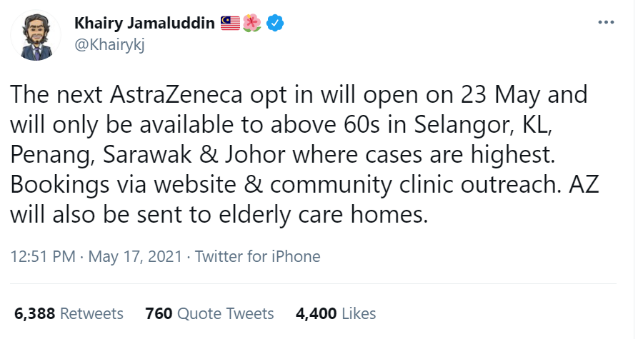 科学、工艺及革新部长Khairy宣布,第2阶段的AstraZeneca疫苗接种计划将于5月23日开放,优先雪隆、槟城、砂拉越、柔佛60岁以上的年长者。